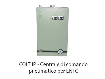 Centrale di comando pneumatica modello IP COLT utilizzata per il funzionamento degli evacuatori. Adatta per la ventilazione giornaliera naturale e per ventilazione antincendio (se combinato con quadro di emergenza). La centrale può essere predisposta per l’azionamento di uno o più gruppi di evacuatori. L’apertura e la chiusura degli evacuatori avviene tramite un selettore manuale posizionato nello sportello anteriore. Il quadro è dotato di segnalatore luminoso per indicare lo stato di attivazione, aperto – chiuso, del gruppo di evacuatori in funzione.
